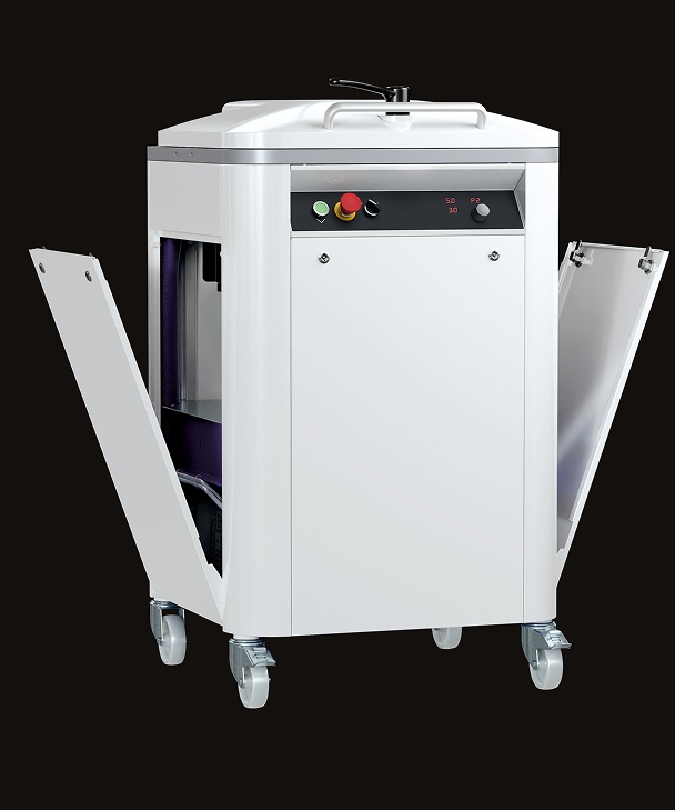 Macchina a movimentazione idraulica, con 2 cilindri per la fase di pressata e un cilindro per il taglio. Pannello di comando con possibilità di regolare il tempo di pressata e di apertura della camera di formatura. L’ arrotondamento viene affettuato con una leva. Pulsante per la pulizia dei coltelli. Possibilità di memorizzare fino a 9 programmi diversi.
